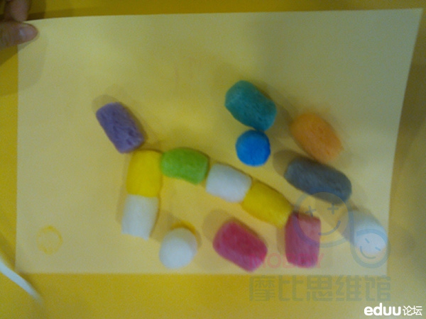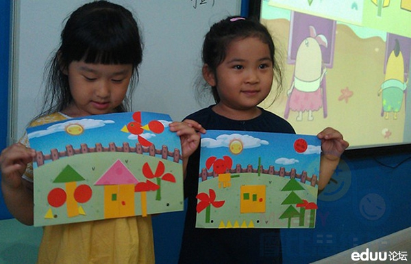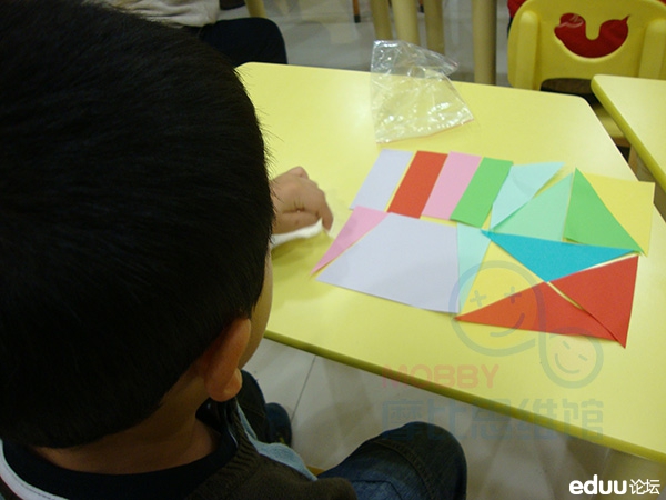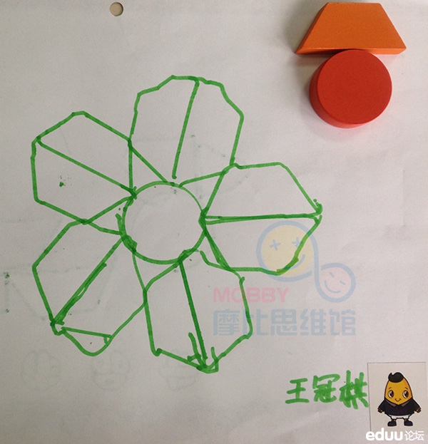 她们的眼里,世界都可以由各种图形宝宝变成的。小树是三角形的,小鸟是圆形和半圆形的,小狗是圆形、半圆形和长方形的,小草是三角形的……瞧,两个小朋友为摩比建立了一个花园。