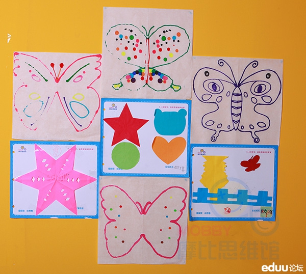 一堆彩笔,几张复写纸。孩子们简单做了几个动作:对折--画几条弯弯曲曲的线--再点上几点--把纸重新打开。忽然间,几只美丽的花蝴蝶,翩翩起舞。