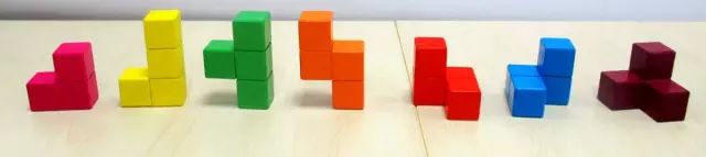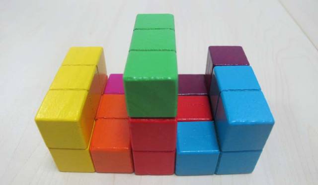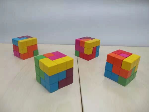 老师给宝贝儿们讲了一个故事:丹麦的一位科学家在听一位物理学家演讲的时候,突发灵感,将四个以内,大小相同的小立方体,以面相连接,构成的所有不规则形状,可以重组成一个较大的立方体。这就是索玛立方体的由来。